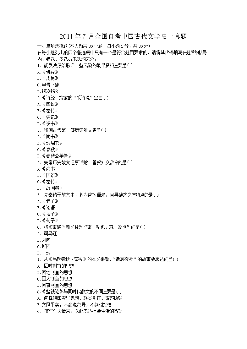 【文檔名稱】 2011年7月全國自考中國古代文學(xué)史一真題(Word版).doc
