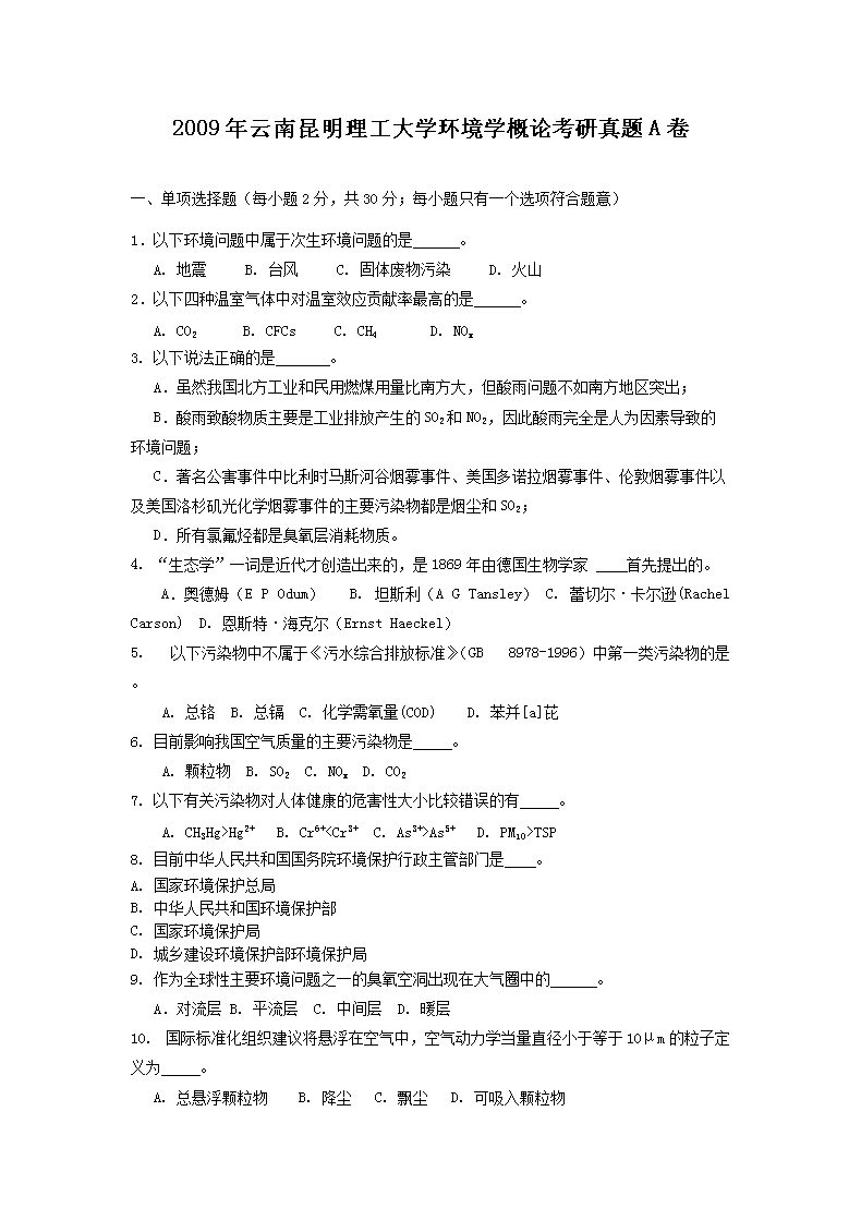 【文檔名稱】 2009年云南昆明理工大學(xué)環(huán)境學(xué)概論考研真題A卷(Word版).doc