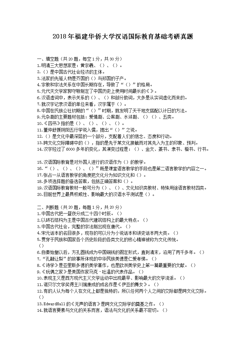 【文檔名稱】 2018年福建華僑大學漢語國際教育基礎考研真題(Word版).doc