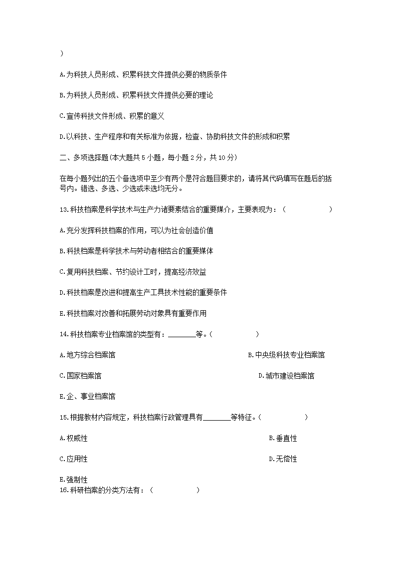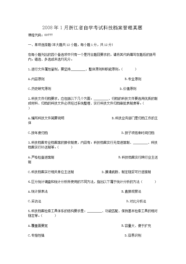 【文檔名稱】 2008年1月浙江省自學(xué)考試科技檔案管理真題(Word版).doc