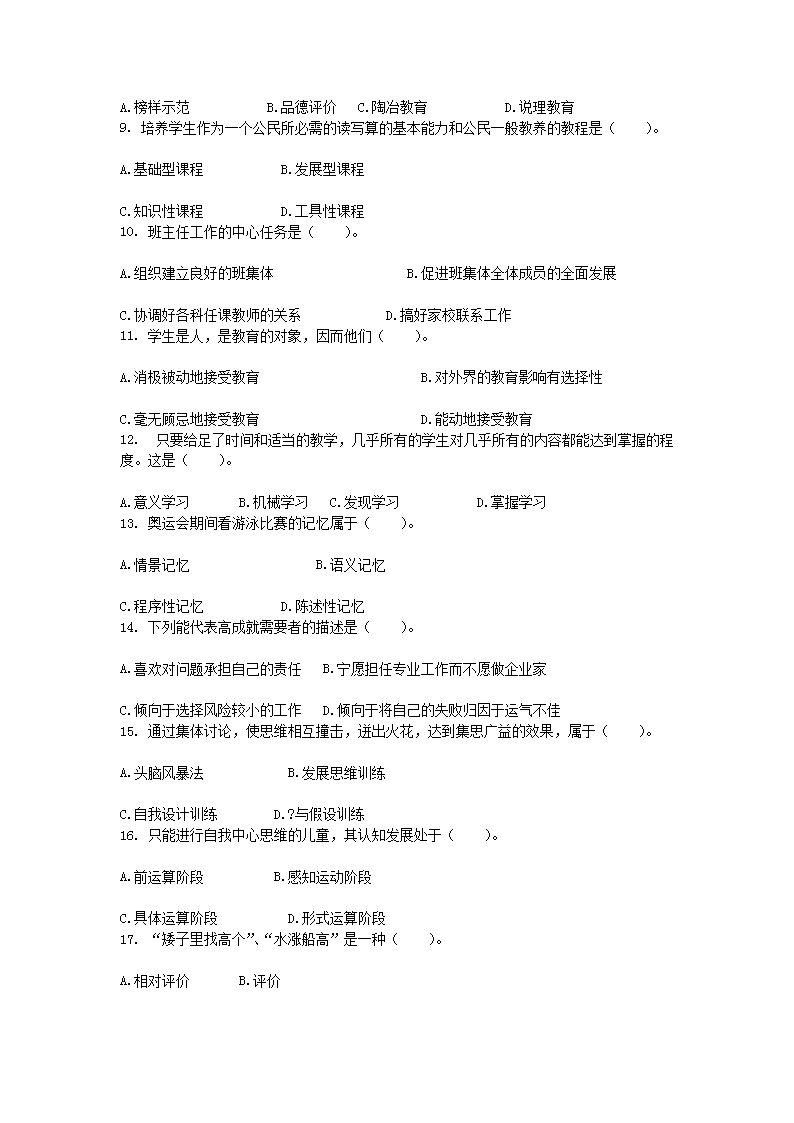 - 2017廣西教師招聘考試教育心理學(xué)與德育工作基礎(chǔ)知識(shí)真題及答案