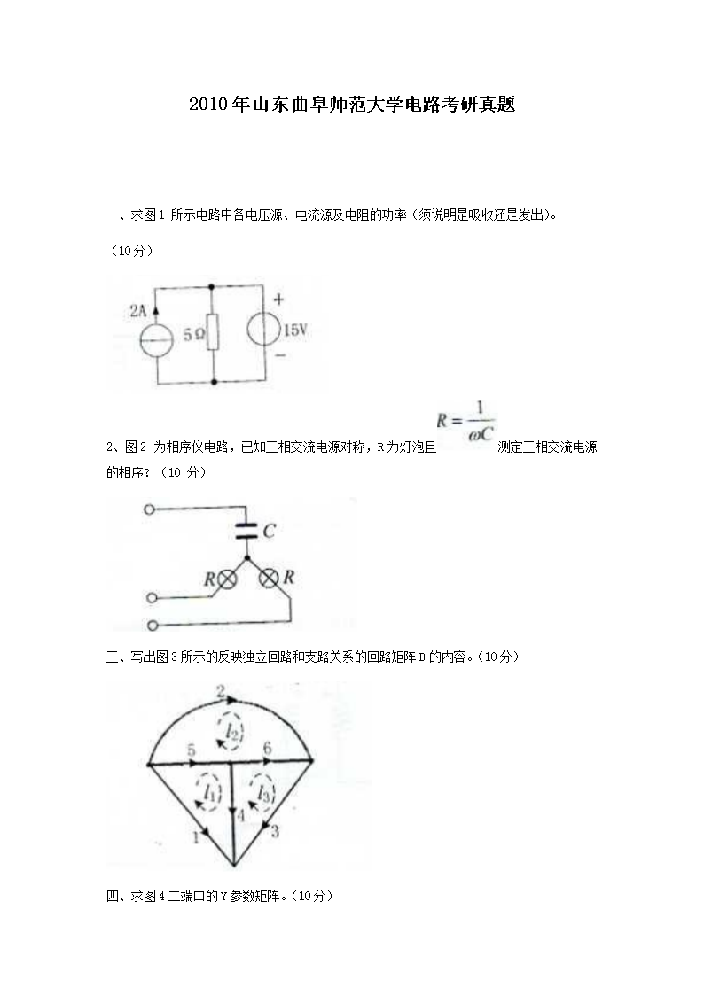 【文檔名稱(chēng)】 2010年山東曲阜師范大學(xué)電路考研真題(Word版).doc