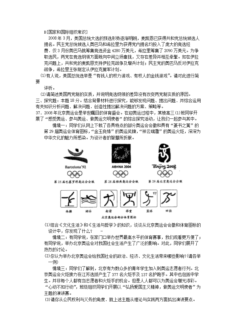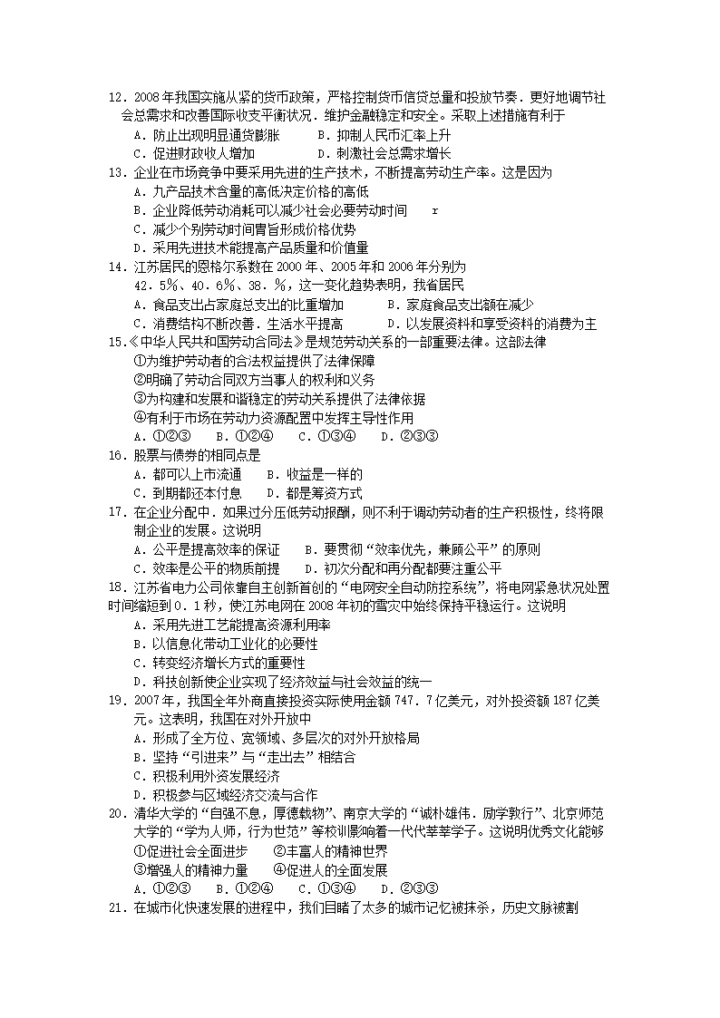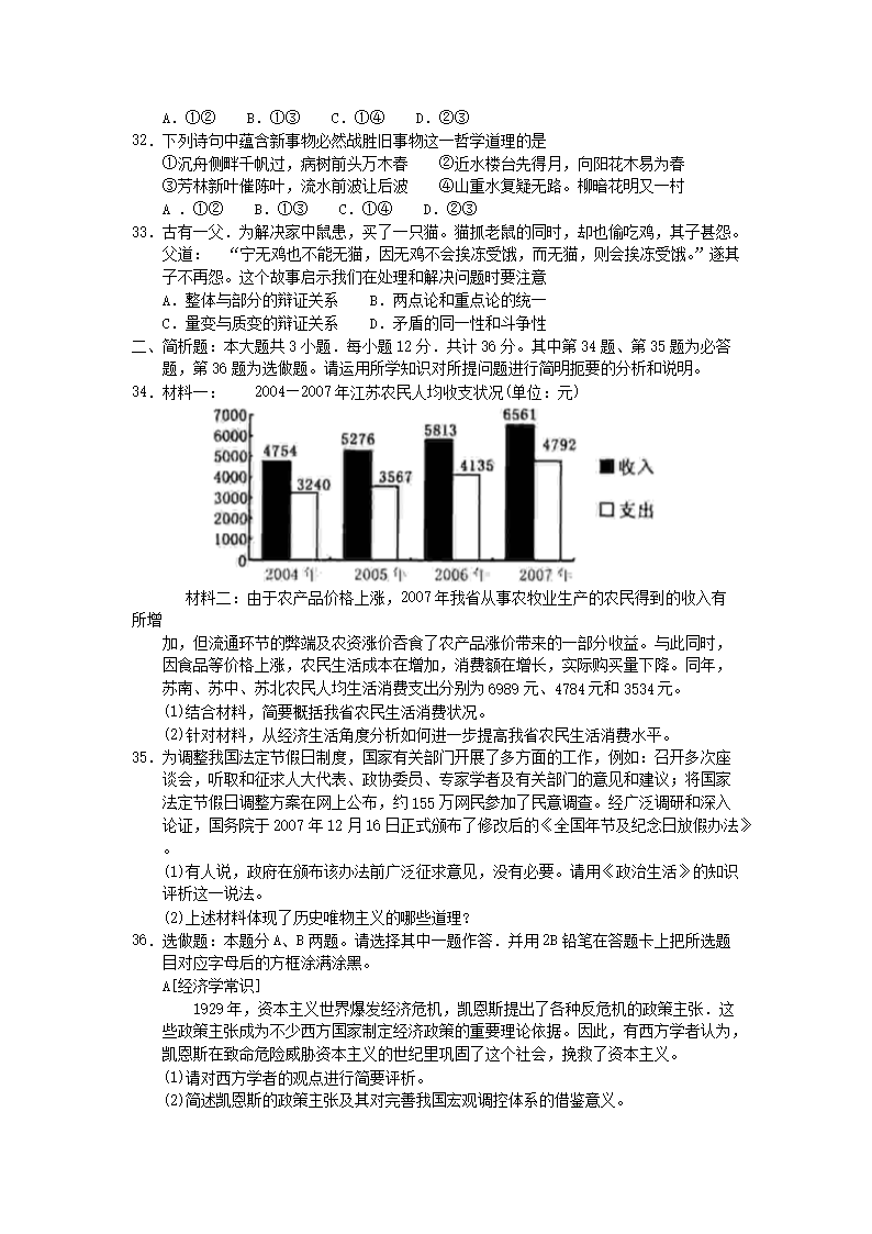 【文檔名稱】 2008年江蘇高考政治真題及答案(Word版).doc