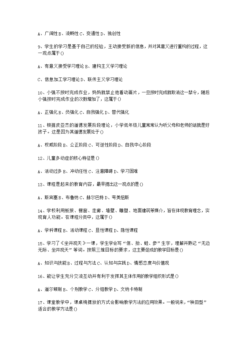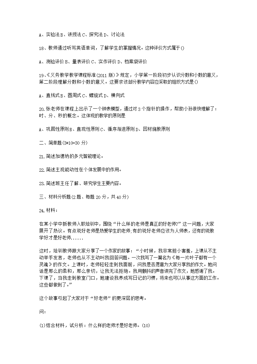 時(shí)間:2021-04-13 14:48:00 來(lái)源:無(wú)憂考網(wǎng) [字體:小 中 大]【文檔名稱】 2017上半年福建教師資格證小學(xué)教育教學(xué)知識(shí)與能力真題及答案(Word版).doc