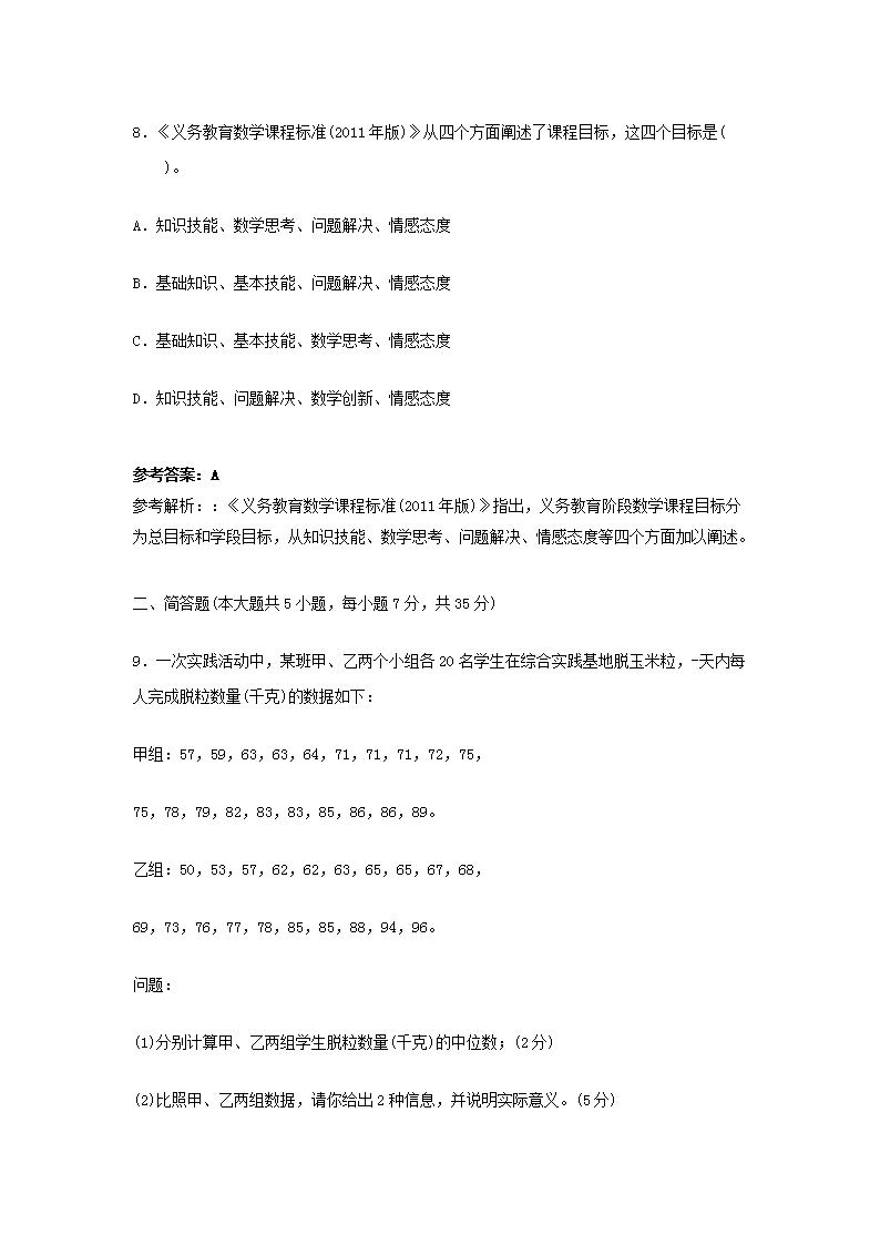 時間:2021-05-06 17:07:00 來源:無憂考網(wǎng) [字體:小 中 大]【文檔名稱】 2019上半年天津教師資格初中數(shù)學(xué)學(xué)科知識與教學(xué)能力真題及答案(Word版).doc