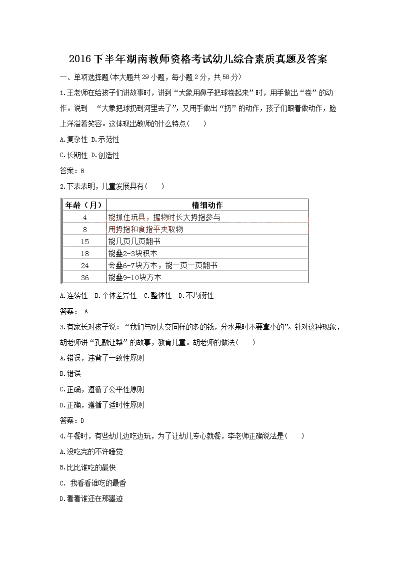【文檔名稱】 2016下半年湖南教師資格考試幼兒綜合素質(zhì)真題及答案(Word版).doc