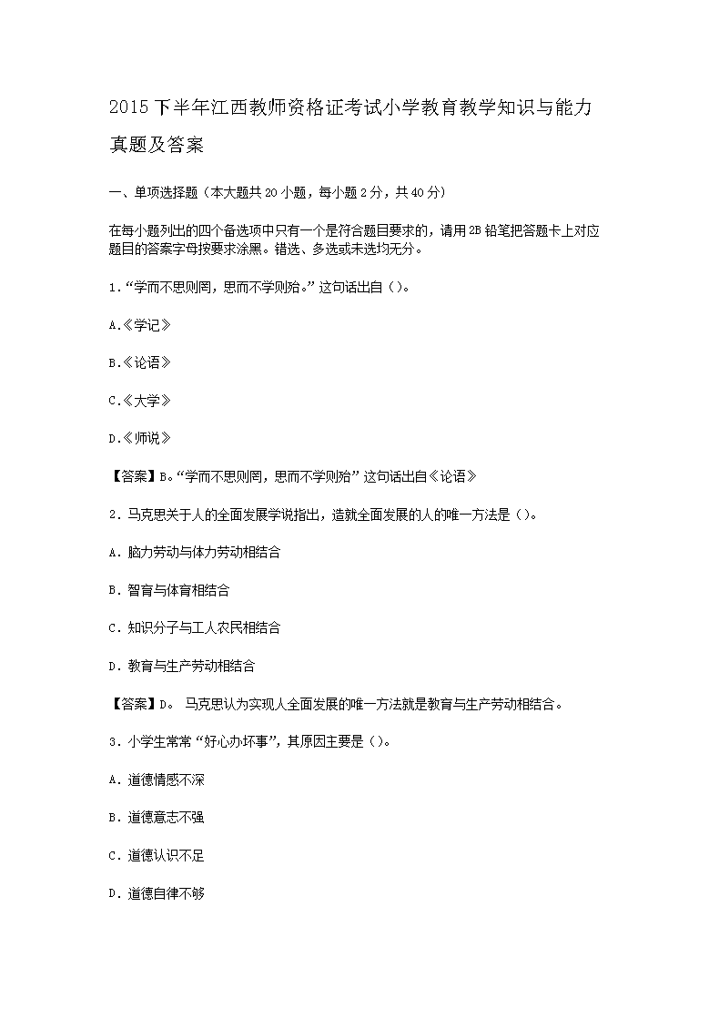 【文檔名稱】 2015下半年江西教師資格證考試小學(xué)教育教學(xué)知識與能力真題及答案(Word版).doc
