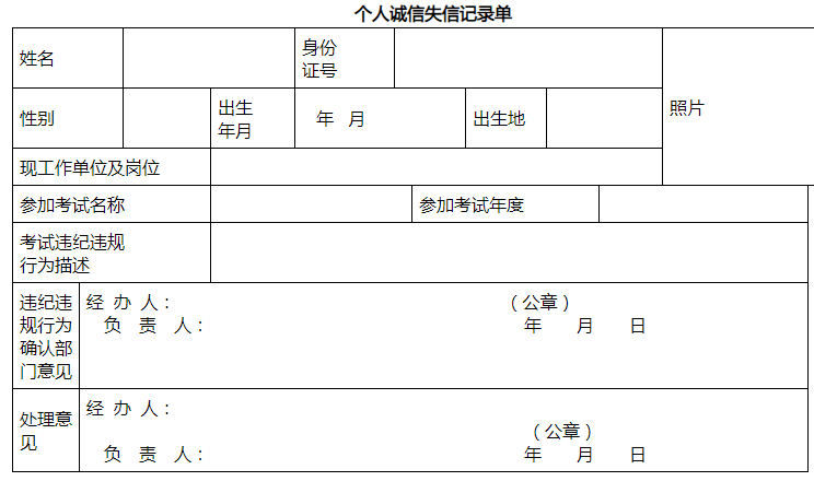 建立失信應(yīng)試人員黑名單制度,加大失信聯(lián)合懲戒力度,加強跨部門聯(lián)動響應(yīng)。完善“一處失信、處處受限”的聯(lián)合懲戒機制,失信行為記入專業(yè)技術(shù)人員資格考試誠信檔案庫,誠信檔案庫的失信應(yīng)試人員納入全國信用信息共享平臺。失信應(yīng)試人員信息將視情況向社會公布或通報,并通知當(dāng)事人所在單位,《個人誠信失信記錄單》(附件2)放入個人檔案,涉嫌犯罪的,移送司法機關(guān)處理。