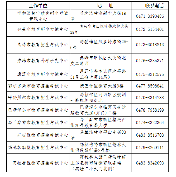七、各盟市教育招生考試中心地址及聯(lián)系電話