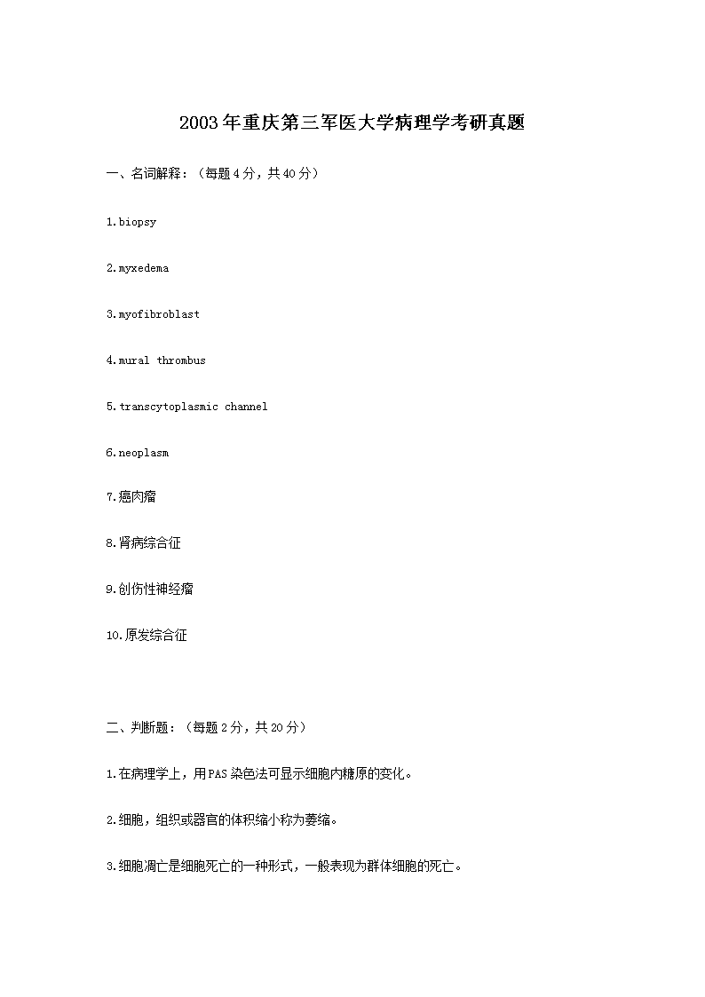 【文檔名稱】 2003年重慶第三軍醫(yī)大學病理學考研真題(Word版).doc