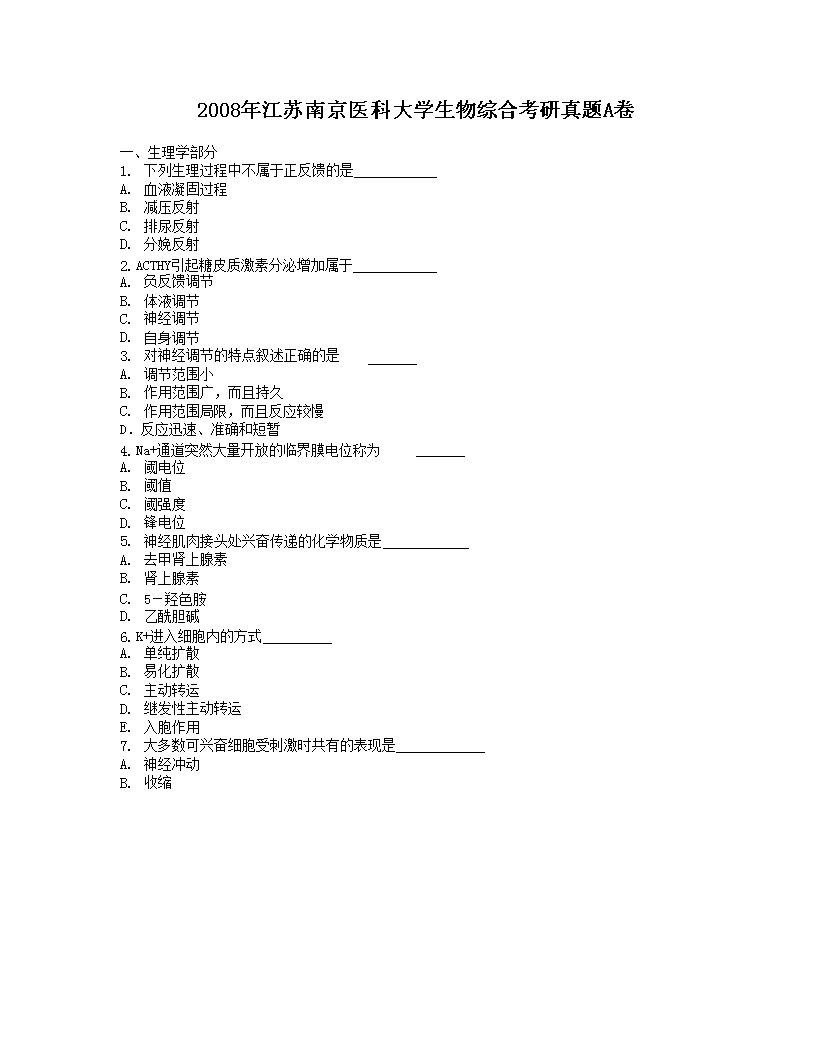 【文檔名稱】 2008年江蘇南京醫(yī)科大學生物綜合考研真題A卷(Word版).doc
