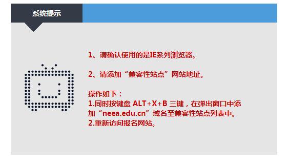 同時(shí)按鍵盤(pán)ALT+X+B三鍵,在彈出窗口中添加“neea.edu.cn”域名至兼容性站點(diǎn)列表中。設(shè)置好站點(diǎn)兼容性后關(guān)閉頁(yè)面重新登錄,如下圖: