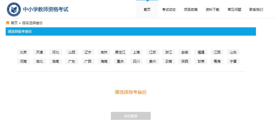 進(jìn)入報(bào)名系統(tǒng)后,選擇符合報(bào)考條件的省份,然后“點(diǎn)擊登錄”。參加2021下半年教師資格筆試考生直接登錄即可,以前年度參加的教師資格證筆試需要重新注冊(cè)。