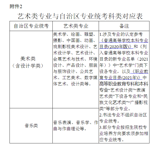 1.自治區(qū)專業(yè)統(tǒng)考未涵蓋的藝術(shù)類專業(yè),高校可組織?,考生可根據(jù)招生院校向社會(huì)公布的招生簡章相關(guān)要求自行參加校考。