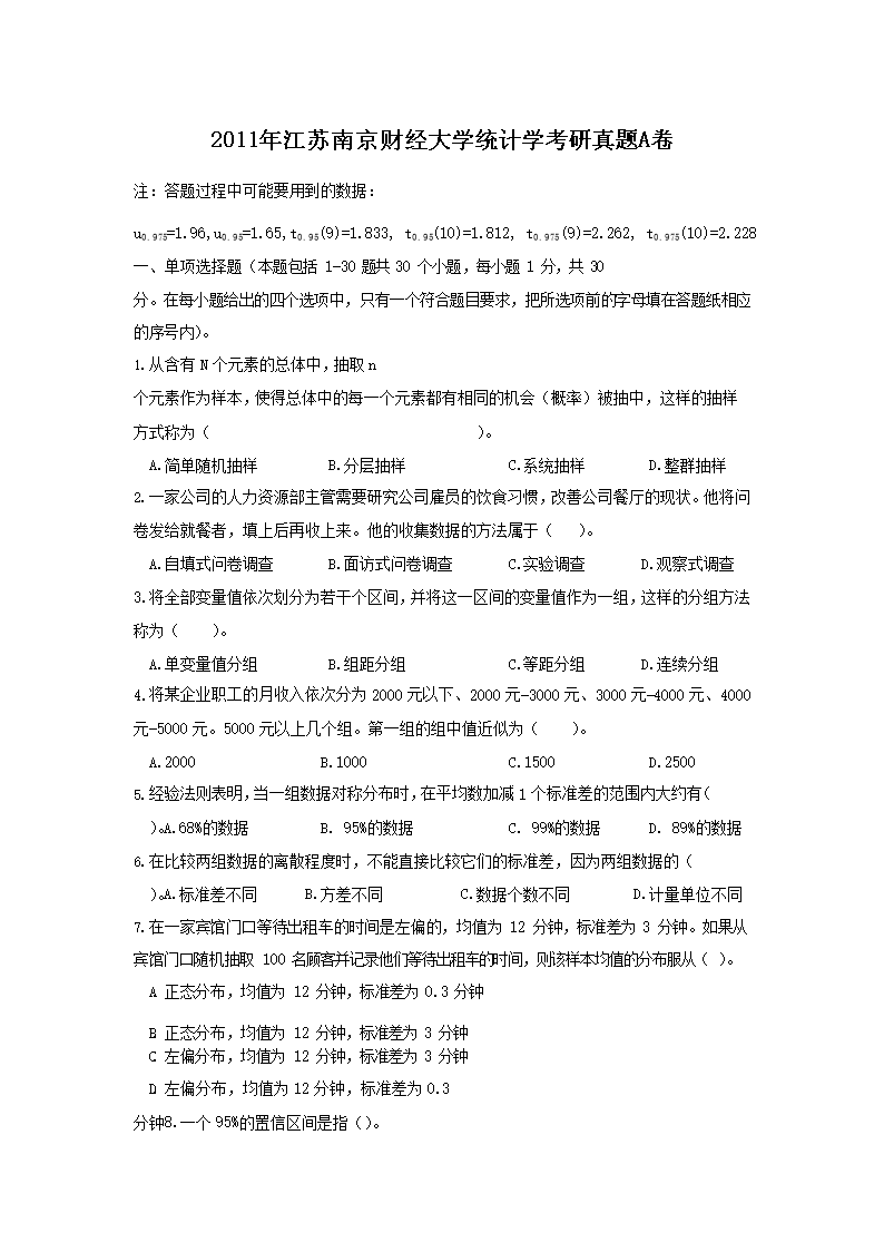 時(shí)間:2021-12-25 17:33:00 來(lái)源:無(wú)憂考網(wǎng) [字體:小 中 大]【文檔名稱】 2011年江蘇南京財(cái)經(jīng)大學(xué)統(tǒng)計(jì)學(xué)考研真題A卷(Word版).doc