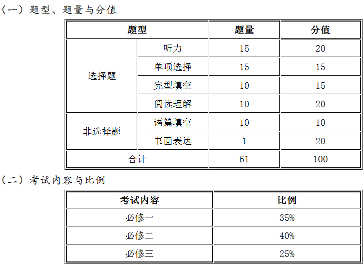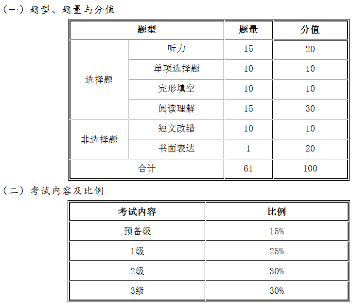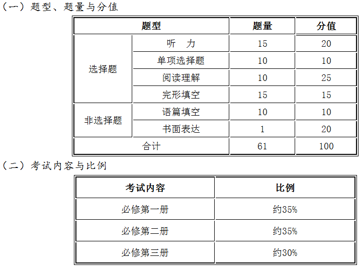 采用閉卷、筆試形式?荚嚂r間90分鐘,卷面滿分100分。其中聽力考試時間20分鐘,滿分20分。
