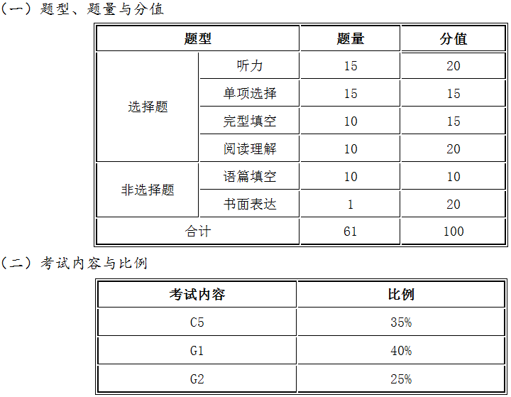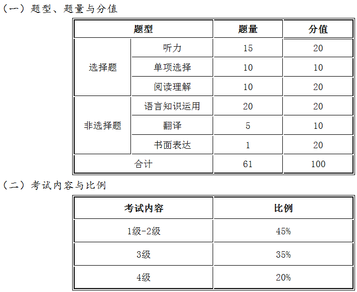 采用閉卷、筆試形式。考試時間90分鐘,卷面滿分100分。其中聽力考試時間20分鐘,滿分20分。