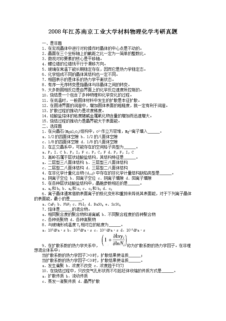 【文檔名稱】 2008年江蘇南京工業(yè)大學材料物理化學考研真題(Word版).doc