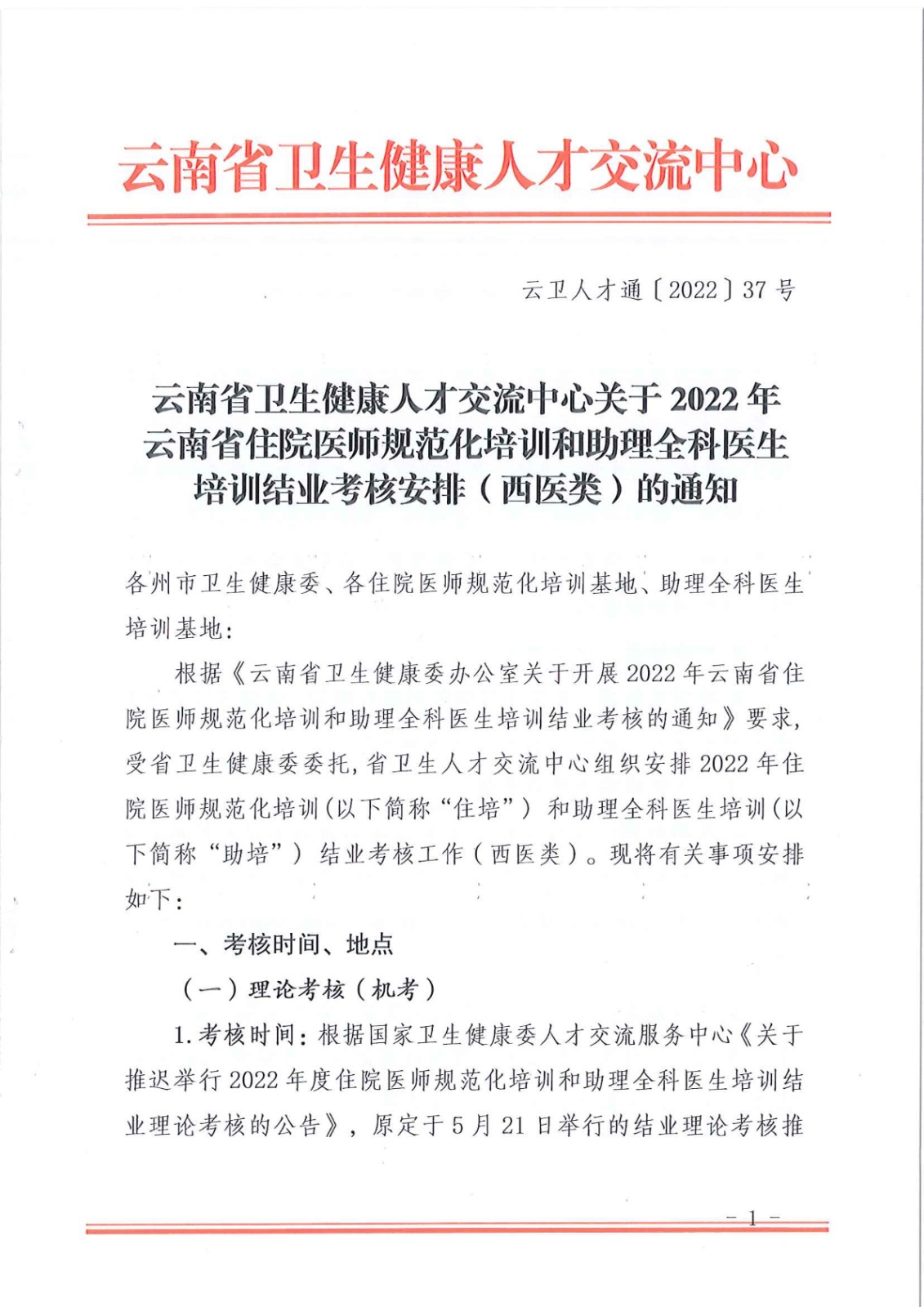 附件:云南省衛(wèi)生健康人才交流中心關(guān)于2022年云南省住院醫(yī)師規(guī)范化培訓(xùn)和助理全科醫(yī)生培訓(xùn)結(jié)業(yè)考核安排(西醫(yī)類)的通知(云衛(wèi)人才通〔2022〕37號(hào))
