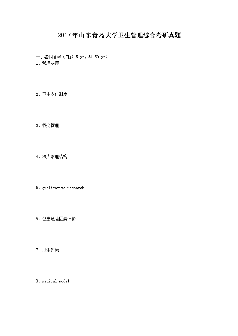 【文檔名稱】 2017年山東青島大學(xué)衛(wèi)生管理綜合考研真題(Word版).doc