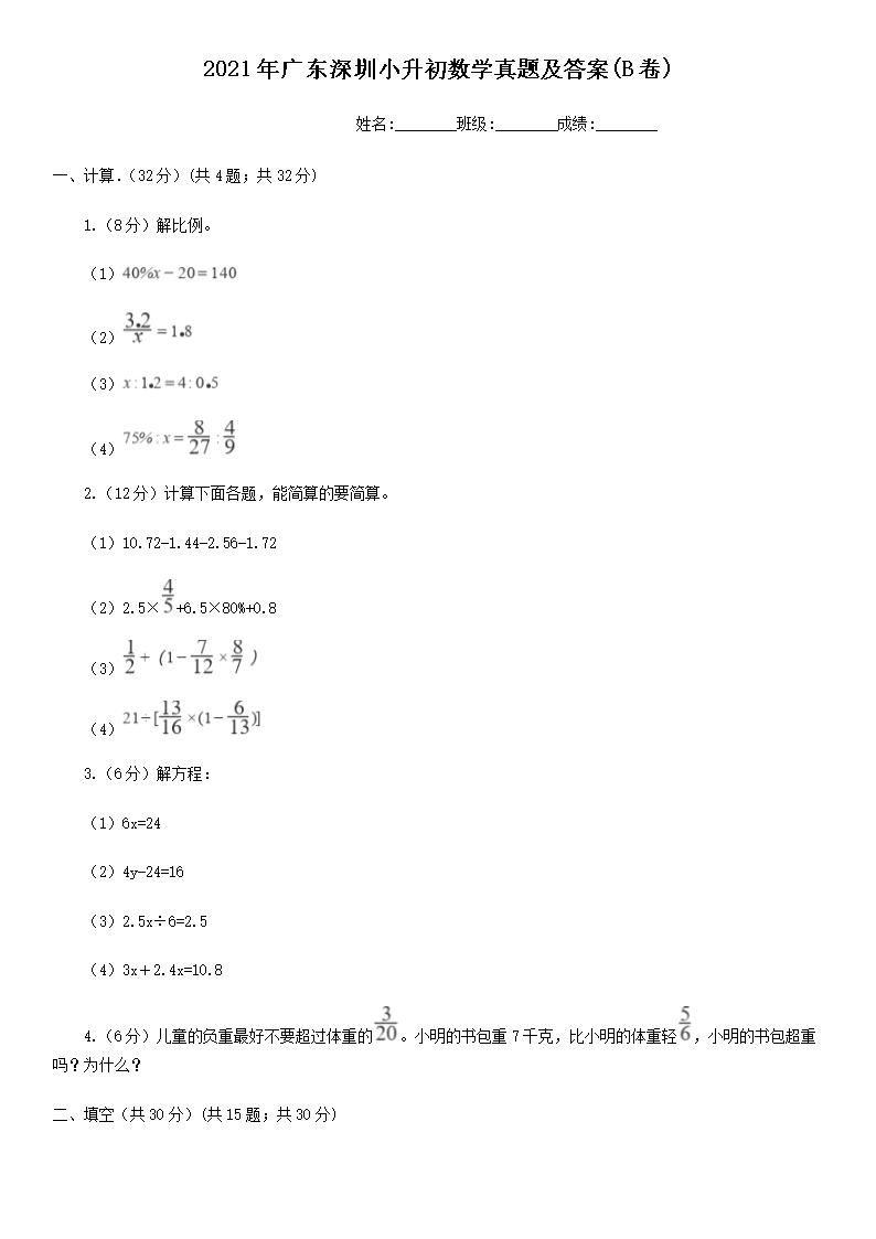【文檔名稱】 2021年廣東深圳小升初數(shù)學(xué)真題及答案(B卷)(Word版).doc