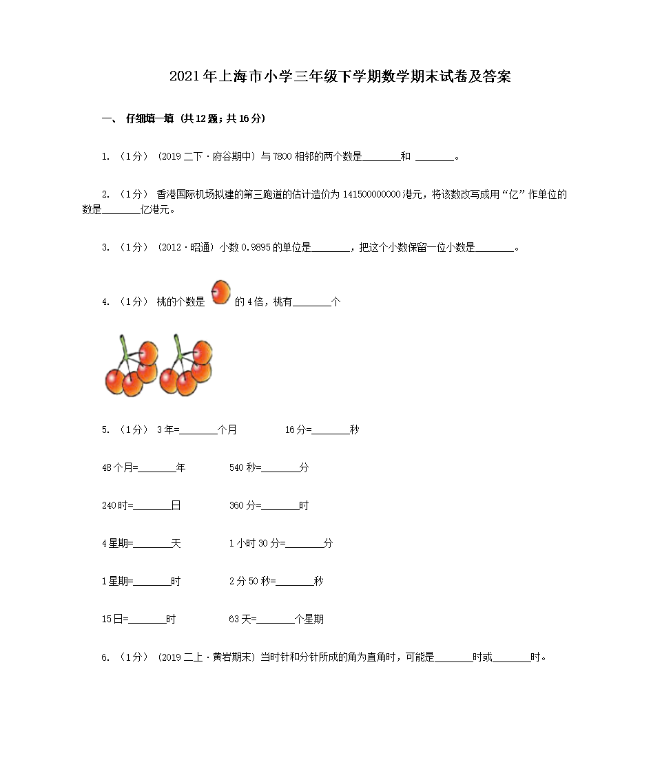 2021年上海市小學(xué)三年級下學(xué)期數(shù)學(xué)期末試卷及答案(Word版)