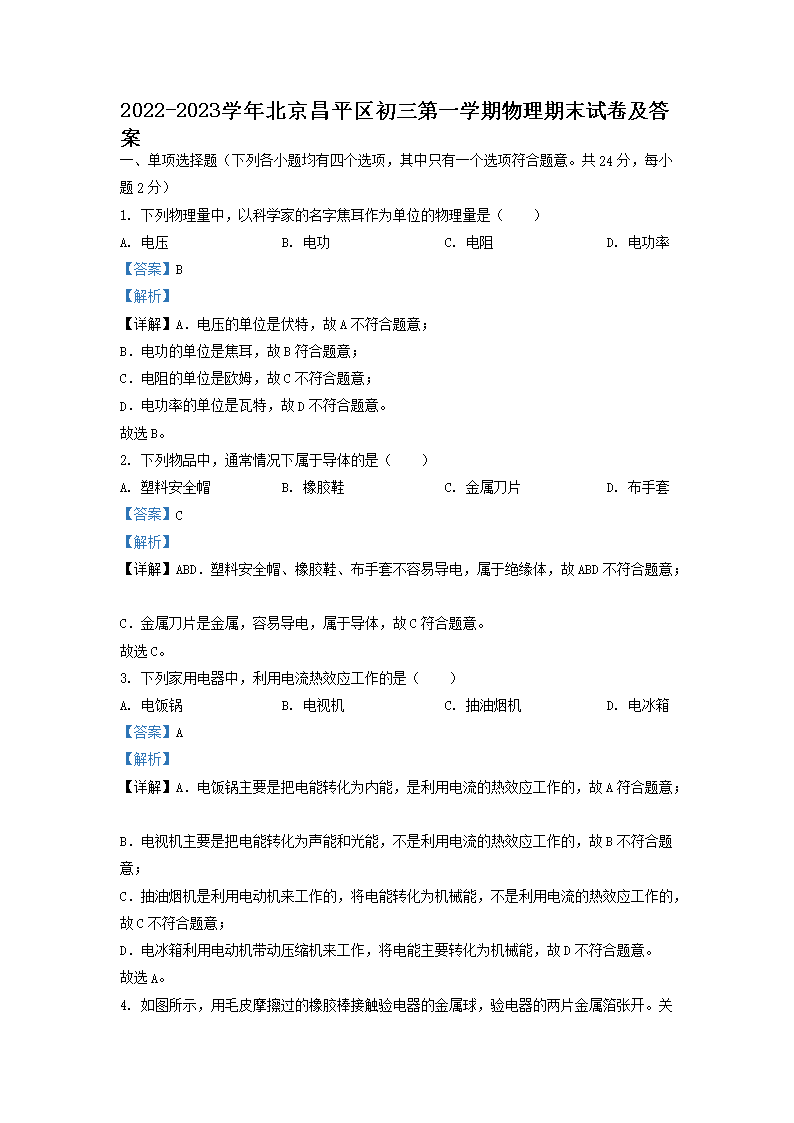 【文檔名稱】 2022-2023學年北京昌平區(qū)初三第一學期物理期末試卷及答案(Word版).doc