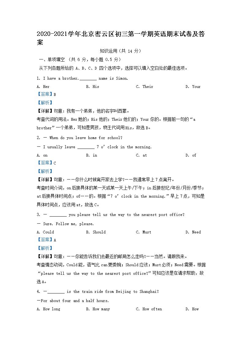 【文檔名稱】 2020-2021學年北京密云區(qū)初三第一學期英語期末試卷及答案(Word版).doc