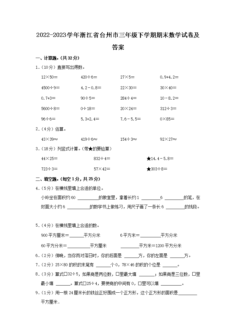 2022-2023學(xué)年浙江省臺(tái)州市三年級(jí)下學(xué)期期末數(shù)學(xué)試卷及答案(Word版)