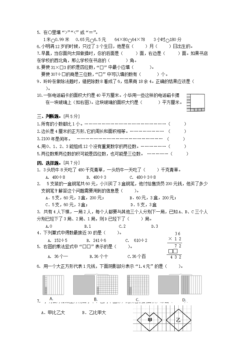 - 2023-2024學(xué)年天津市濱海新區(qū)小學(xué)三年級(jí)上冊(cè)數(shù)學(xué)期末試題及答案