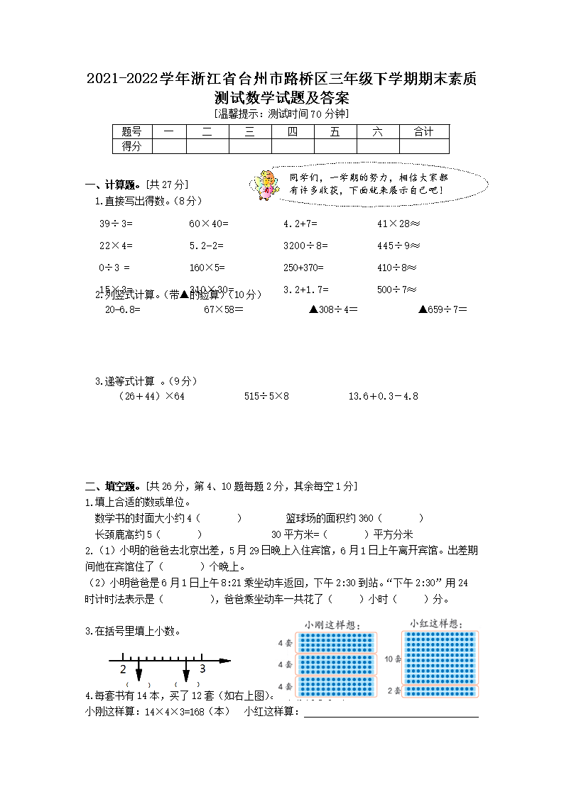 2021-2022學(xué)年浙江省臺(tái)州市路橋區(qū)三年級(jí)下學(xué)期期末素質(zhì)測(cè)試數(shù)學(xué)試題及答案(Word版)