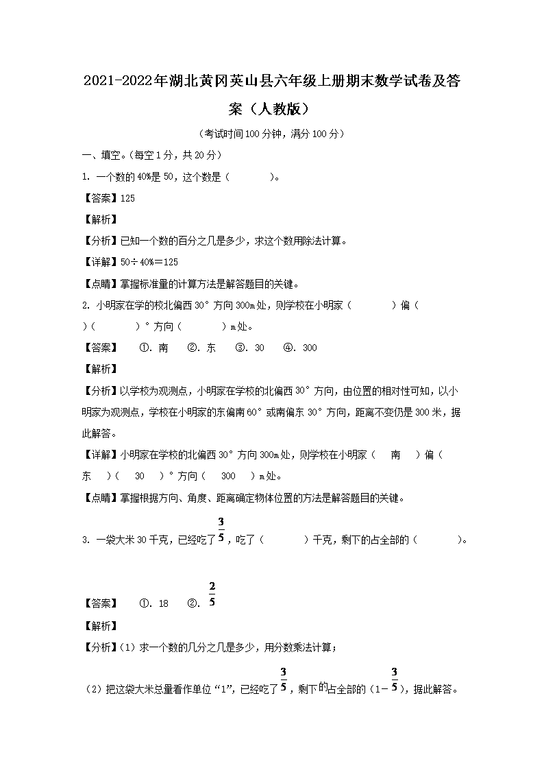 時間:2023-10-08 14:42:00 來源:無憂考網(wǎng) [字體:小 中 大]【文檔名稱】 2021-2022年湖北黃岡英山縣六年級上冊期末數(shù)學(xué)試卷及答案(人教版)(Word版).doc