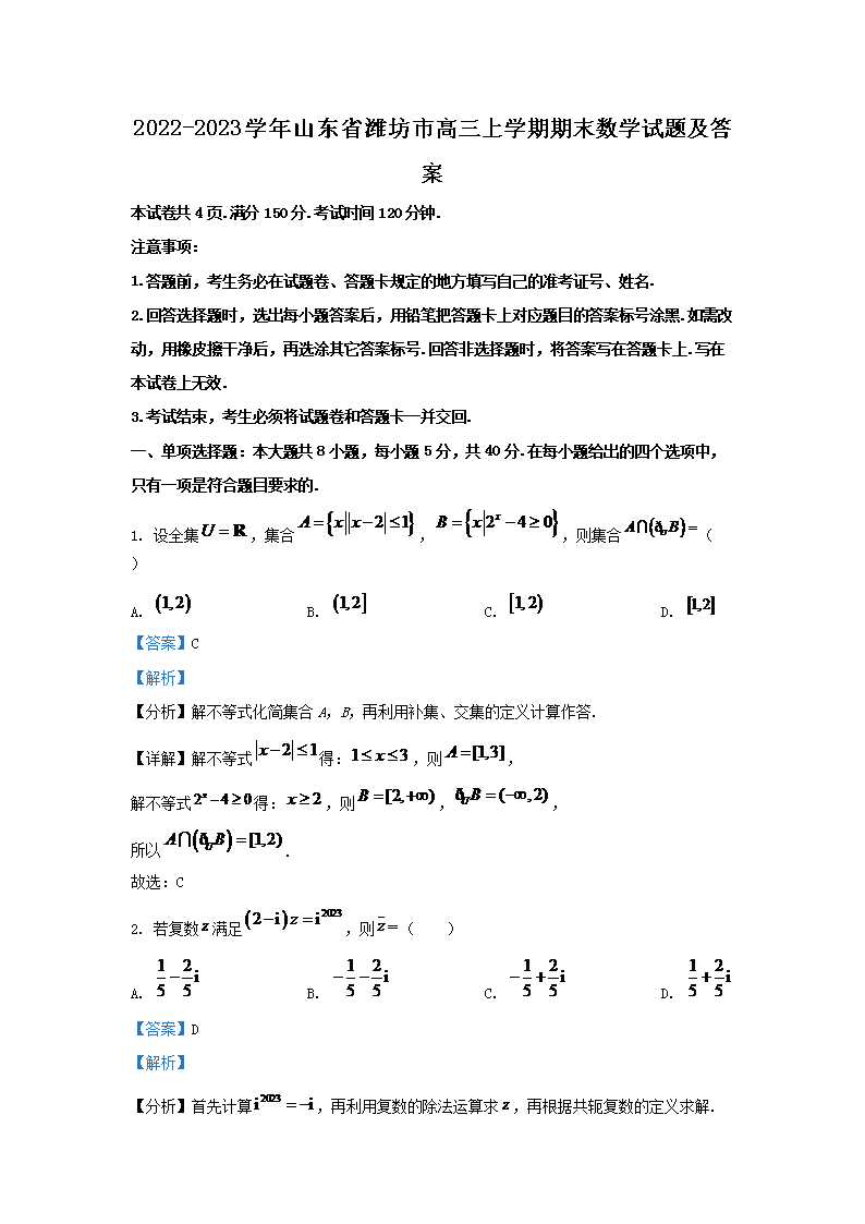 2022-2023學(xué)年山東省濰坊市高三上學(xué)期期末數(shù)學(xué)試題及答案(Word版)