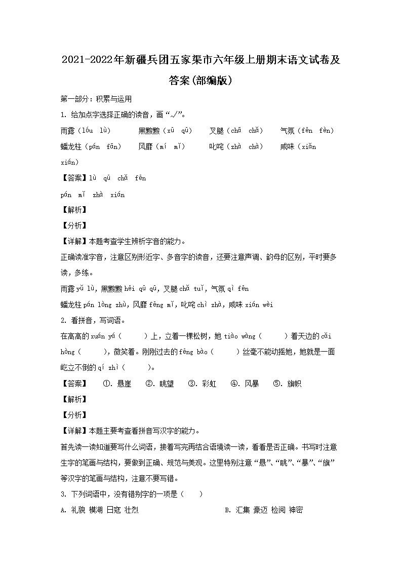 2021-2022年新疆兵團(tuán)五家渠市六年級(jí)上冊(cè)期末語(yǔ)文試卷及答案(部編版)(Word版)