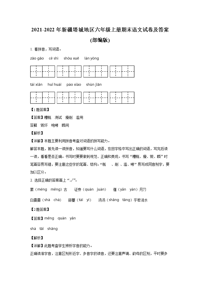 【文檔名稱】 2021-2022年新疆塔城地區(qū)六年級上冊期末語文試卷及答案(部編版)(Word版).doc
