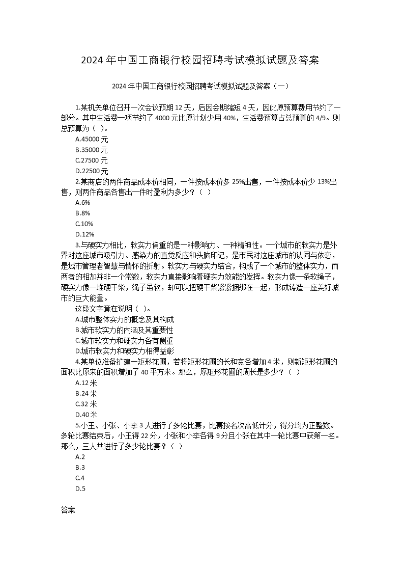 【文檔預(yù)覽】 無憂考網(wǎng)整理發(fā)布2024年中國(guó)工商銀行校園招聘考試模擬試題及答案(Word版),前五頁(yè)預(yù)覽如下: