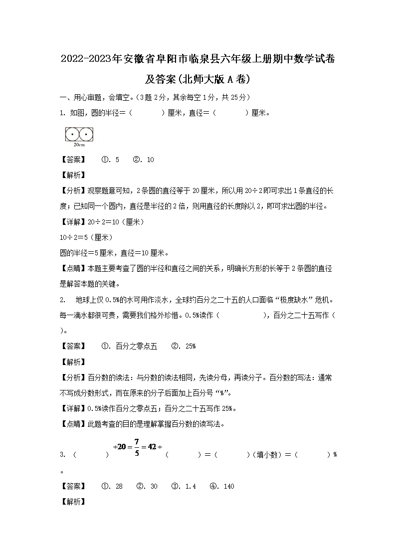 【文檔預(yù)覽】 無憂考網(wǎng)整理發(fā)布2022-2023年安徽省阜陽市臨泉縣六年級上冊期中數(shù)學(xué)試卷及答案(北師大版A卷)(Word版),前五頁預(yù)覽如下: