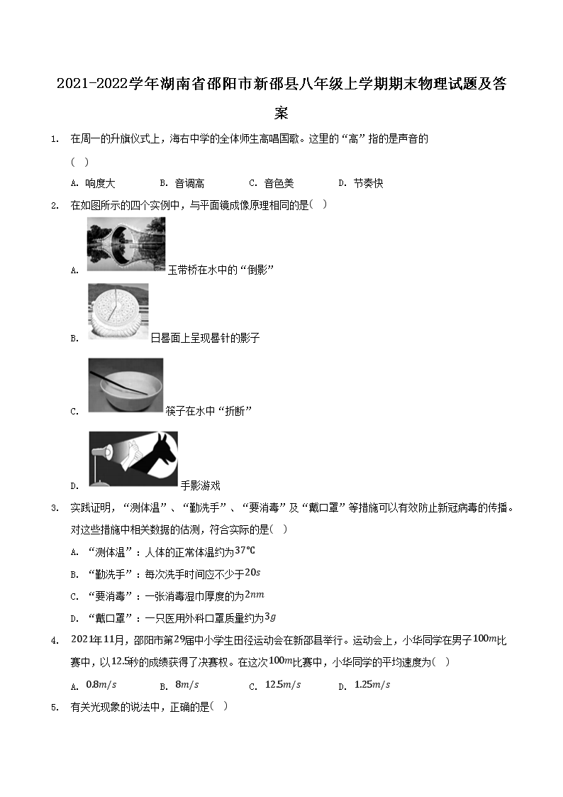 2021-2022學(xué)年湖南省邵陽(yáng)市新邵縣八年級(jí)上學(xué)期期末物理試題及答案(Word版)