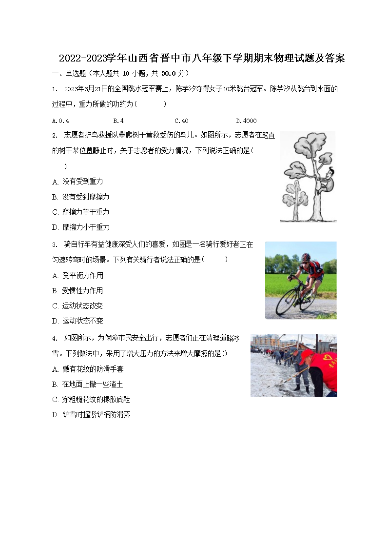 2022-2023學(xué)年山西省晉中市八年級(jí)下學(xué)期期末物理試題及答案(Word版)