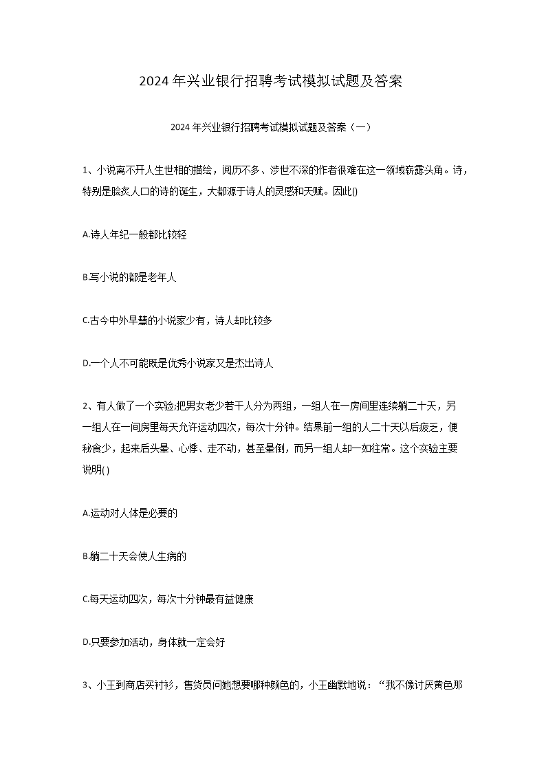 【文檔名稱】 2024年興業(yè)銀行招聘考試模擬試題及答案(Word版).doc