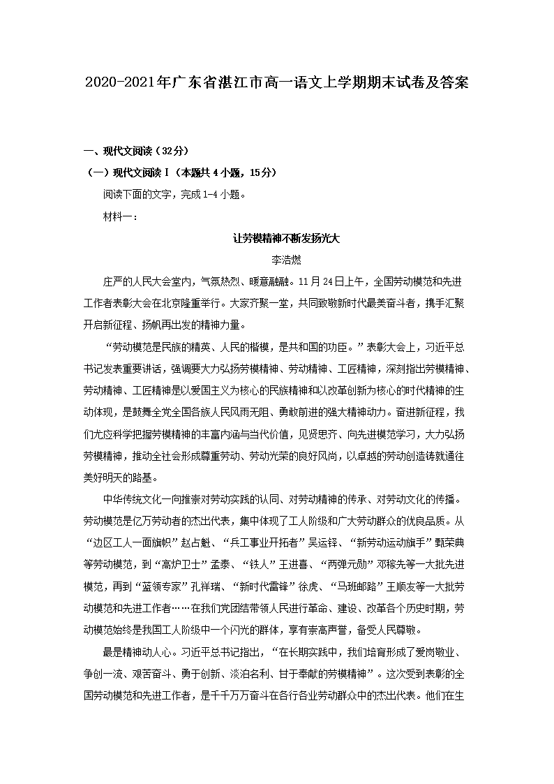 2020-2021年廣東省湛江市高一語(yǔ)文上學(xué)期期末試卷及答案(Word版)