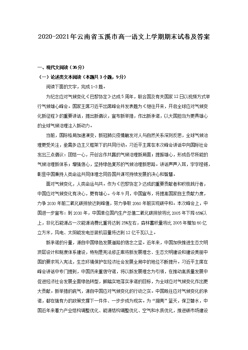 【文檔名稱】 2020-2021年云南省玉溪市高一語文上學(xué)期期末試卷及答案(Word版).doc