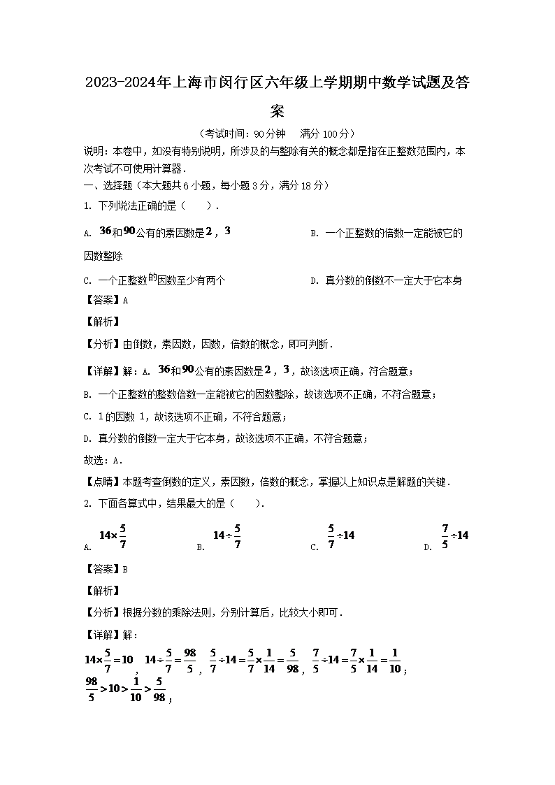 2023-2024年上海市閔行區(qū)六年級(jí)上學(xué)期期中數(shù)學(xué)試題及答案(Word版)