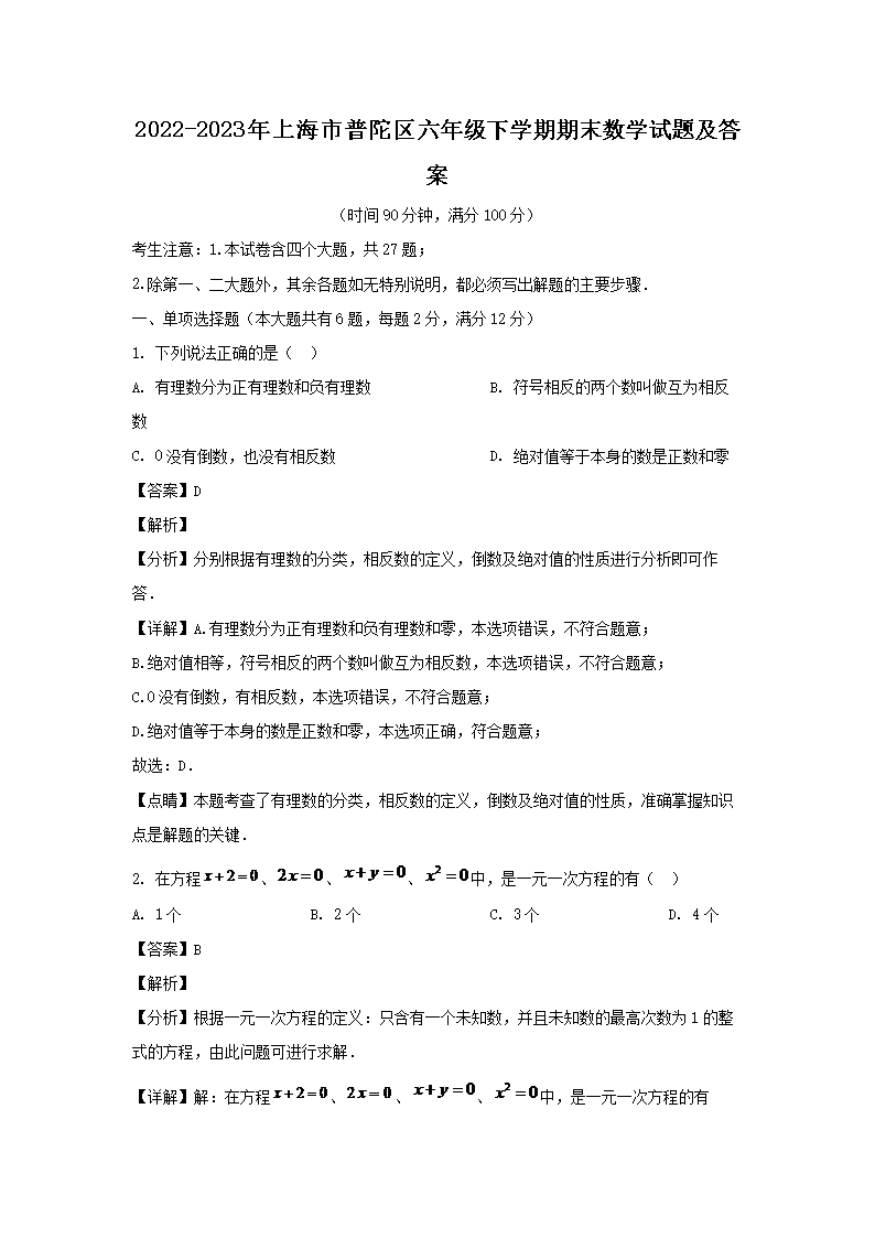 2022-2023年上海市普陀區(qū)六年級下學(xué)期期末數(shù)學(xué)試題及答案(Word版)