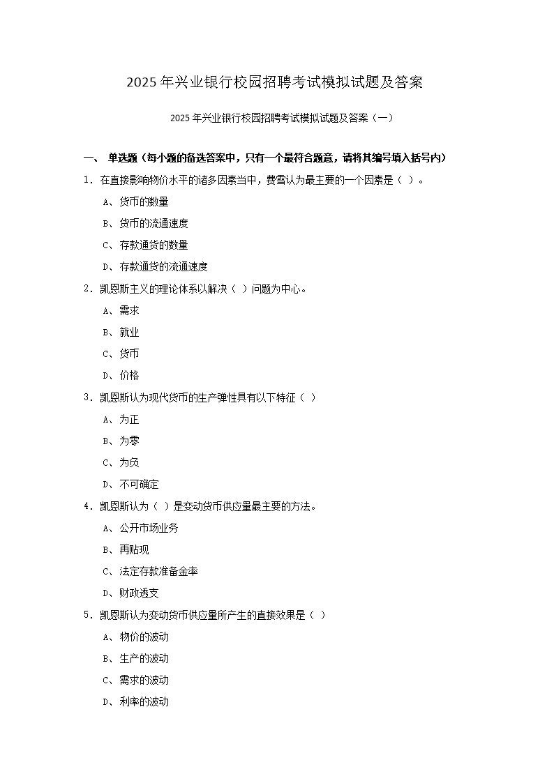 【文檔名稱】 2025年興業(yè)銀行校園招聘考試模擬試題及答案(Word版).doc