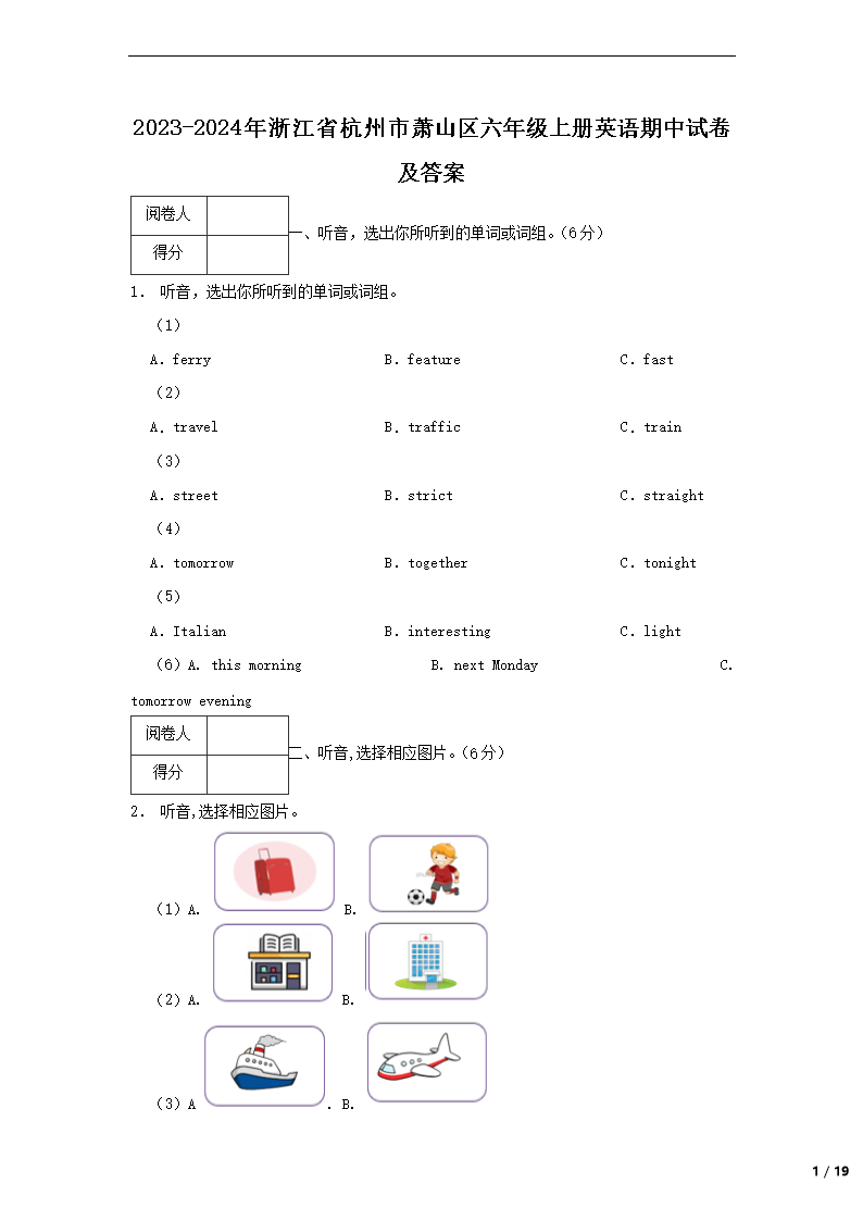 【文檔預(yù)覽】 無(wú)憂考網(wǎng)整理發(fā)布2023-2024年浙江省杭州市蕭山區(qū)六年級(jí)上冊(cè)英語(yǔ)期中試卷及答案(Word版),前五頁(yè)預(yù)覽如下: