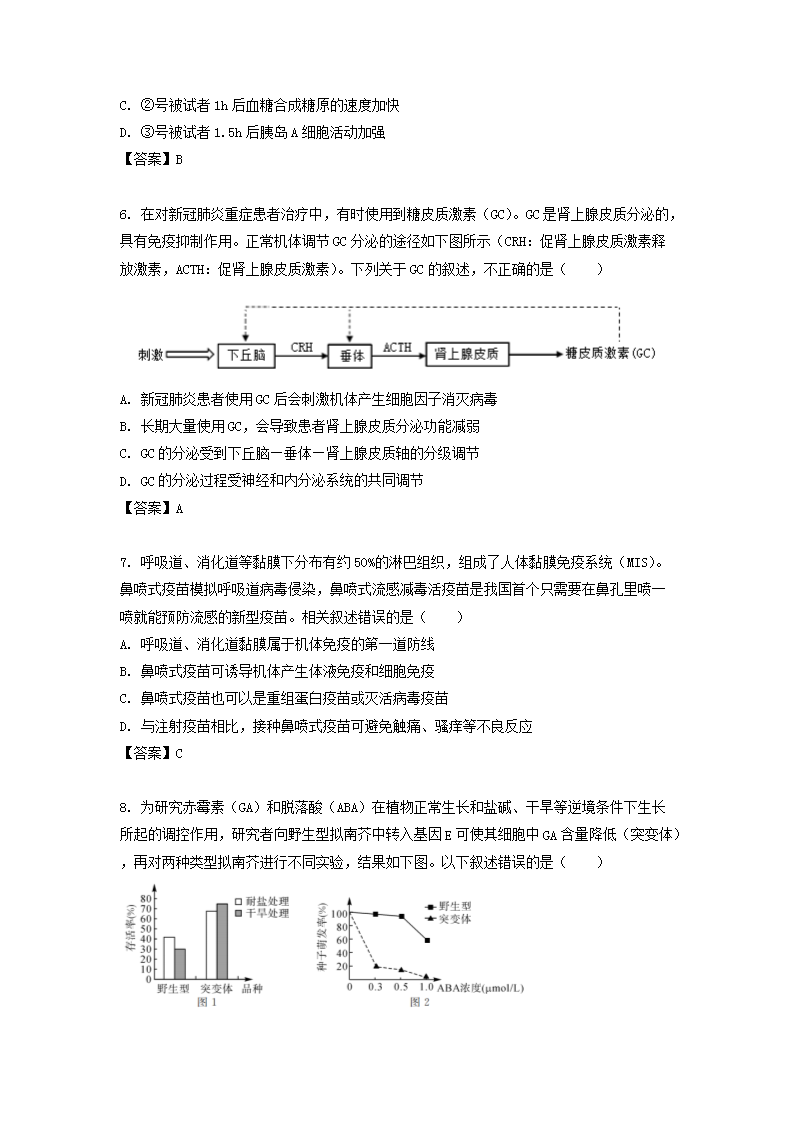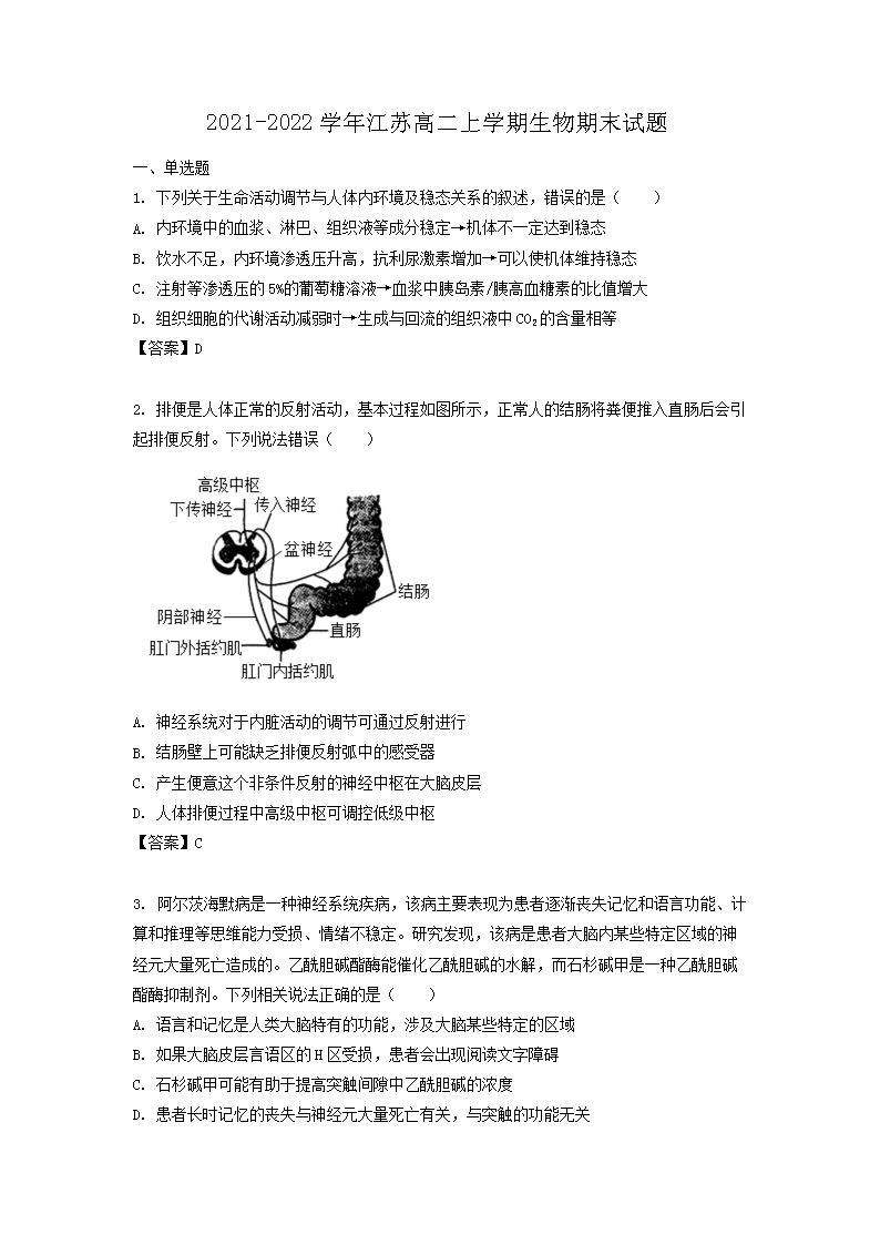 - 2021-2022學(xué)年江蘇南京高二下學(xué)期生物期末考試題及答案