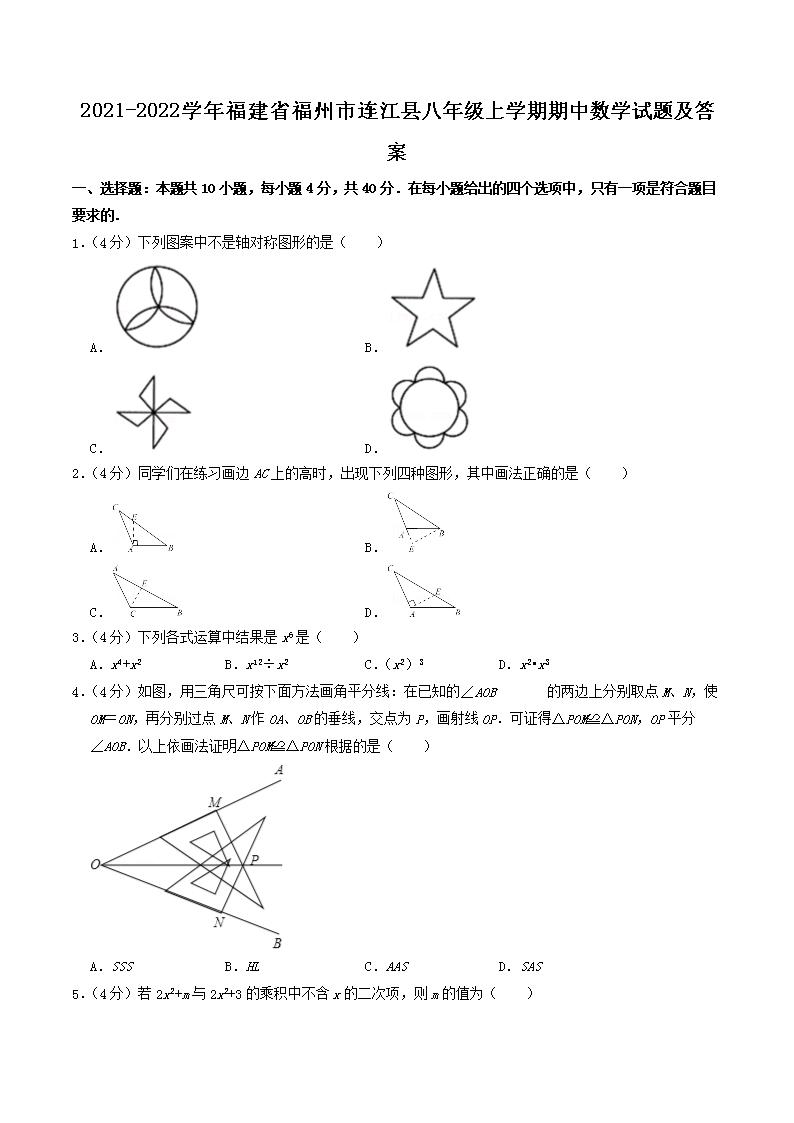 【文檔預(yù)覽】 無憂考網(wǎng)整理發(fā)布2021-2022學(xué)年福建省福州市連江縣八年級上學(xué)期期中數(shù)學(xué)試題及答案(Word版),前五頁預(yù)覽如下: