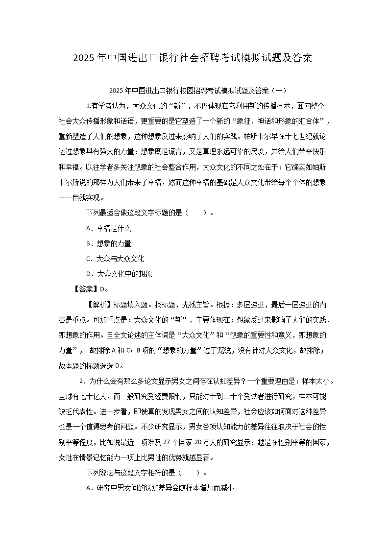 【文檔預(yù)覽】 無(wú)憂考網(wǎng)整理發(fā)布2025年中國(guó)進(jìn)出口銀行社會(huì)招聘考試模擬試題及答案(Word版),前五頁(yè)預(yù)覽如下: