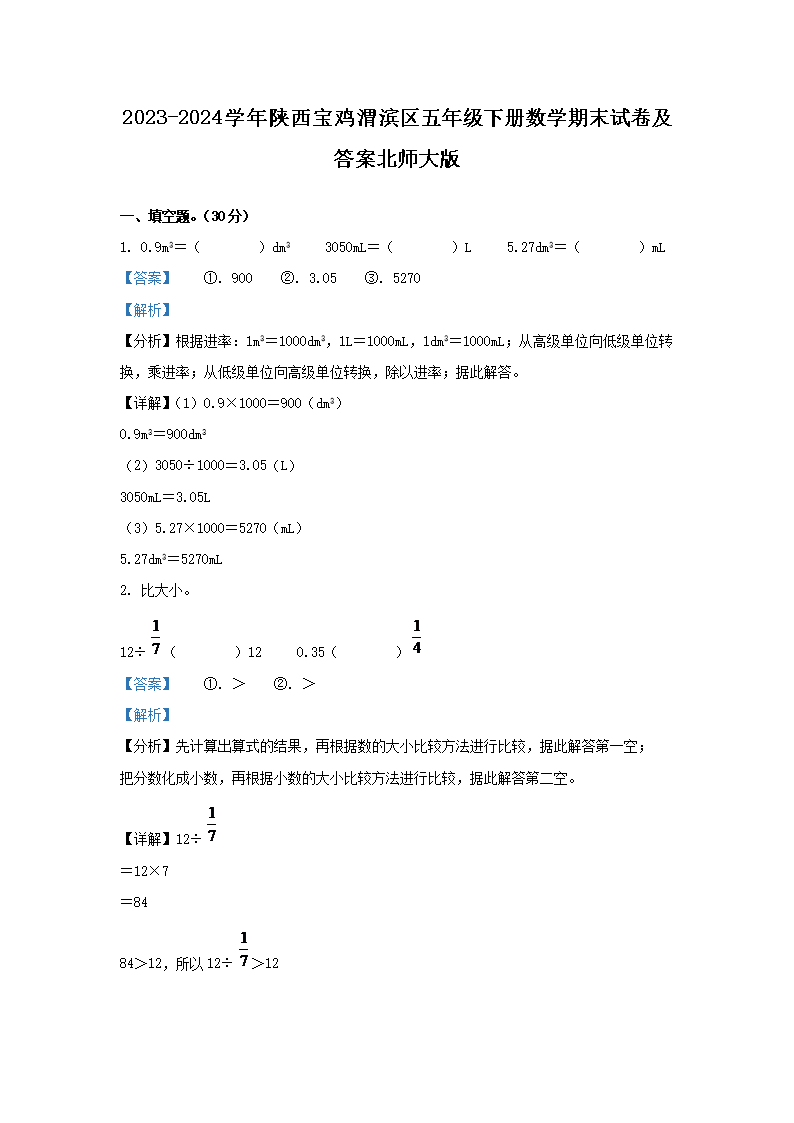 【文檔預(yù)覽】 無憂考網(wǎng)整理發(fā)布2023-2024學(xué)年陜西寶雞渭濱區(qū)五年級下冊數(shù)學(xué)期末試卷及答案北師大版(Word版),前五頁預(yù)覽如下: